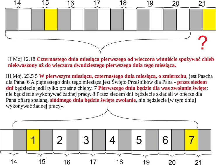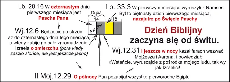 Wszystkie te nakazy dotyczą „daty” czternastego dnia miesiąca i nie ma mowy, że przejdzie to na noc 15-go , bo zaznaczone jest: podczas tej nocy. Wszystkie wersety Moj. 12. 6-12 dotyczą 14-go dnia.