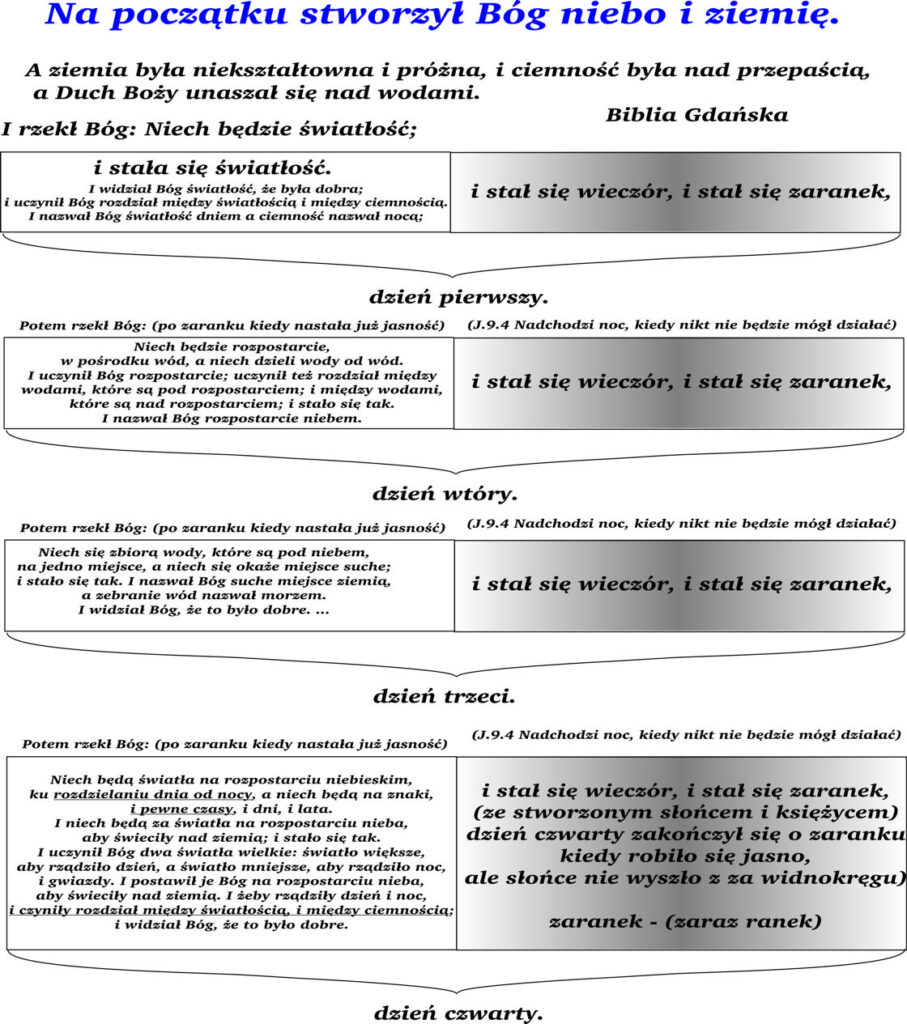 Większość z ludzi zwraca uwagę tylko na ostatnie zdanie „i stał się wieczór, i stał się zaranek, dzień pierwszy..” wskazując na to, że dzień zaczyna się od wieczora jednak okres od wieczora do zaranku stanowi jedynie połowę doby w której panuje ciemność (noc). Gdzie więc w opisie pierwszego dnia pracy był dzień? Czyli światłość? Oczywiście był przed nocą czyli w wersetach od 3 i 4.