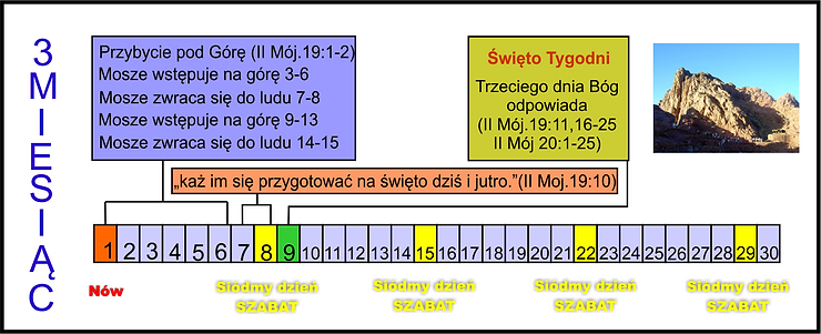 Chronologia wydarzeń na górze Synaj i data święta tygodni, jak również siódmego dnia szabatu zostały rozpisane na podstawie instrukcji obliczeń święta tygodni opisanego w III Moj.23 Opis tego święta daje nam niepodważalne dowody, że siódmy dzień szabatu przypada w trzech kolejnych miesiącach na 8, 15, 22 i 29. ( W kalendarzu współczesnym nie zdarza się żeby soboty przez trzy miesiące wypadały w ten sam dzień miesiąca.)